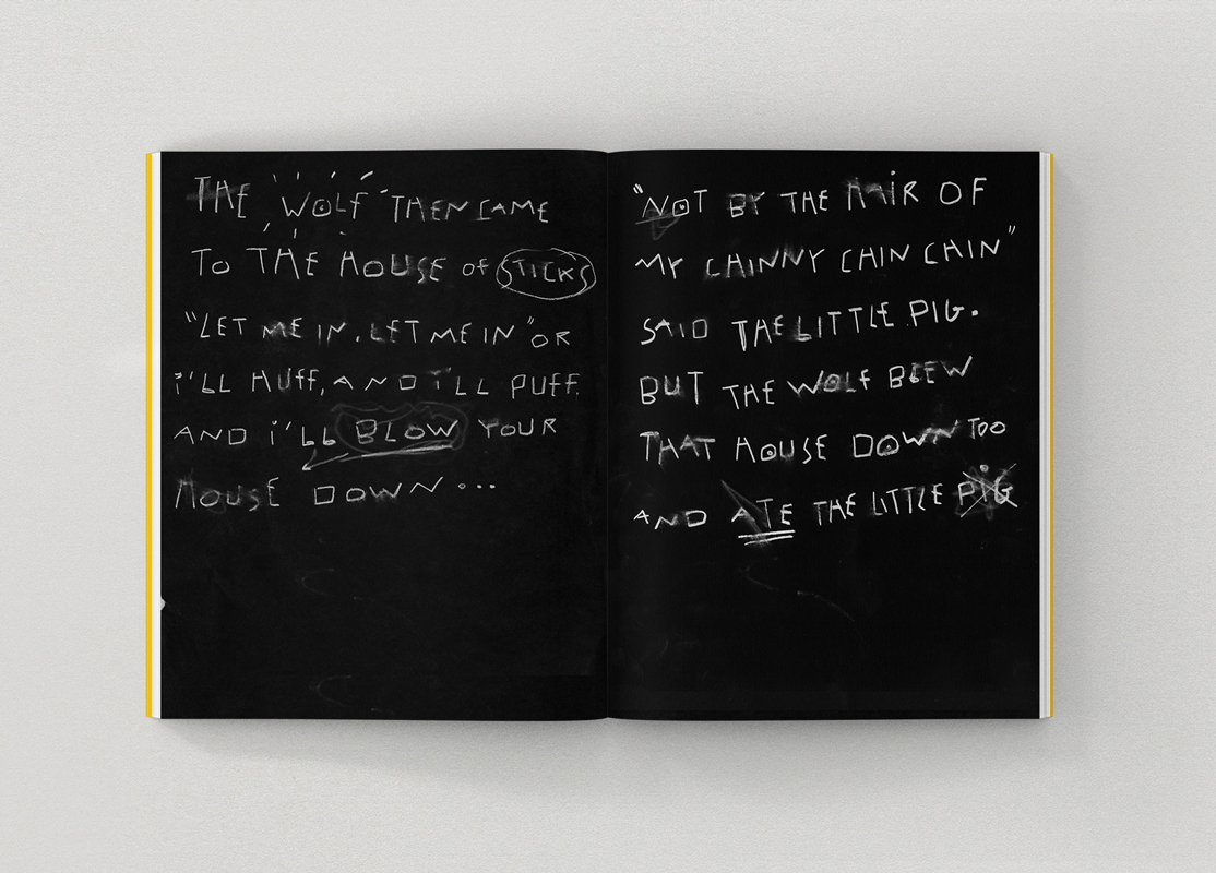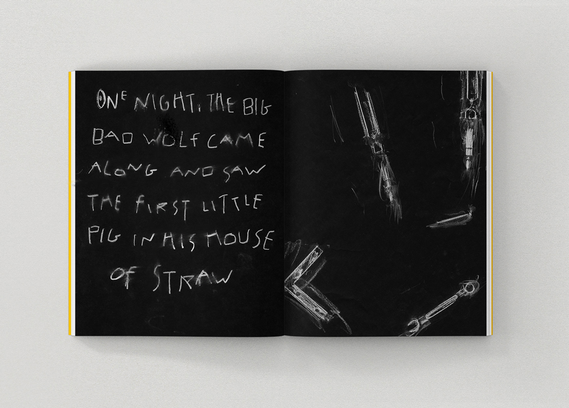 The three little pigs are builders, architects. I experimented with tools, seeking to implement to the context and energy of the narrative.